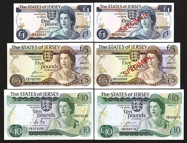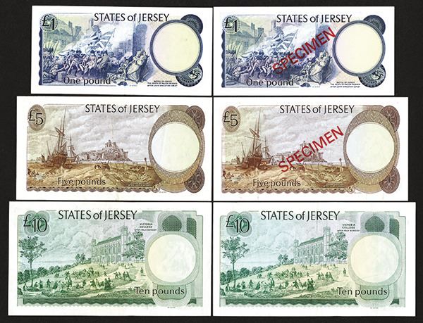 Jersey. 1, 5, 10 Pounds, SCWPM 11a, 12a, 13a, b. Fine-Very Fine, the last a bit better; 1, 5 Pounds, SCWPM 11s2, 12s2. Signature 3, Leslie May. Specimen overprint in red on both sides. Choice Uncirculated. 6 pieces.