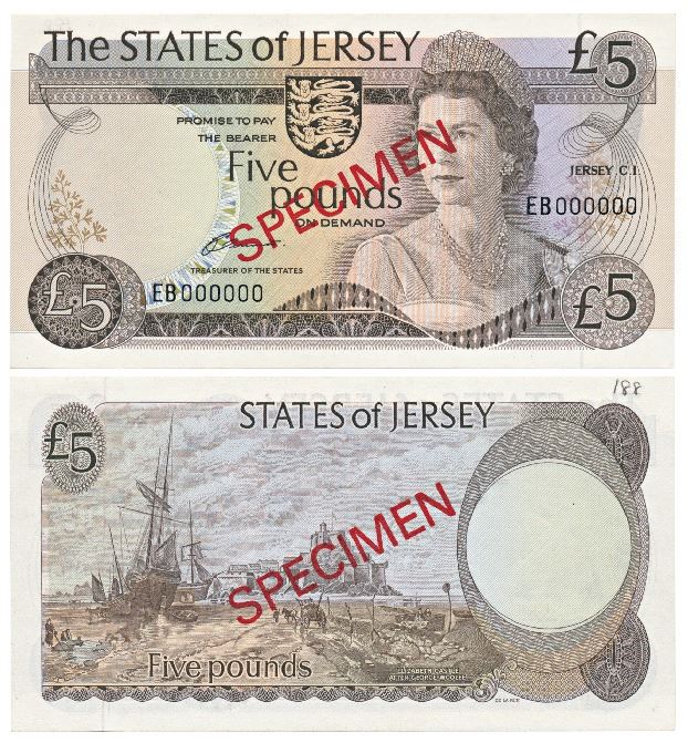 State of Jersey, Pounds 5, Specimen written across the note on obverse & reverse, Uncirculated, Rare.