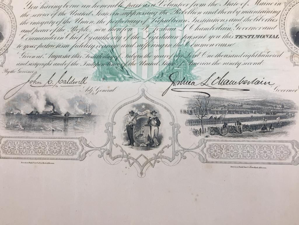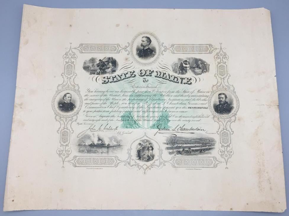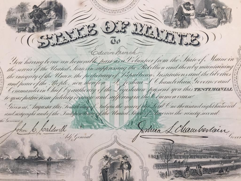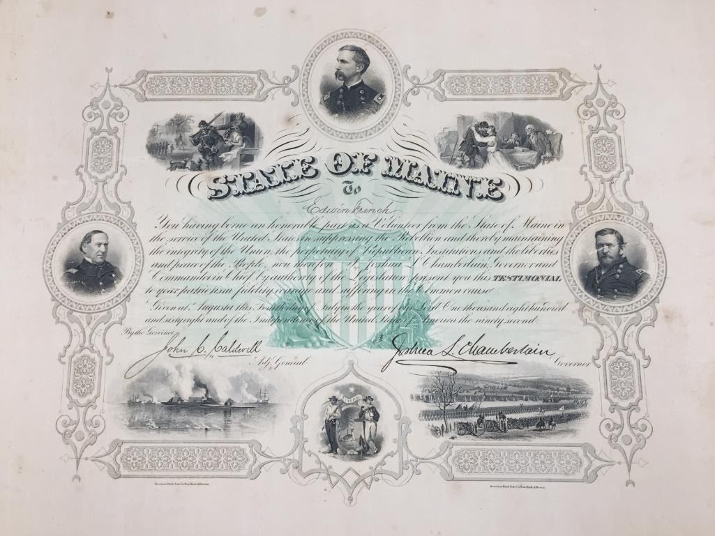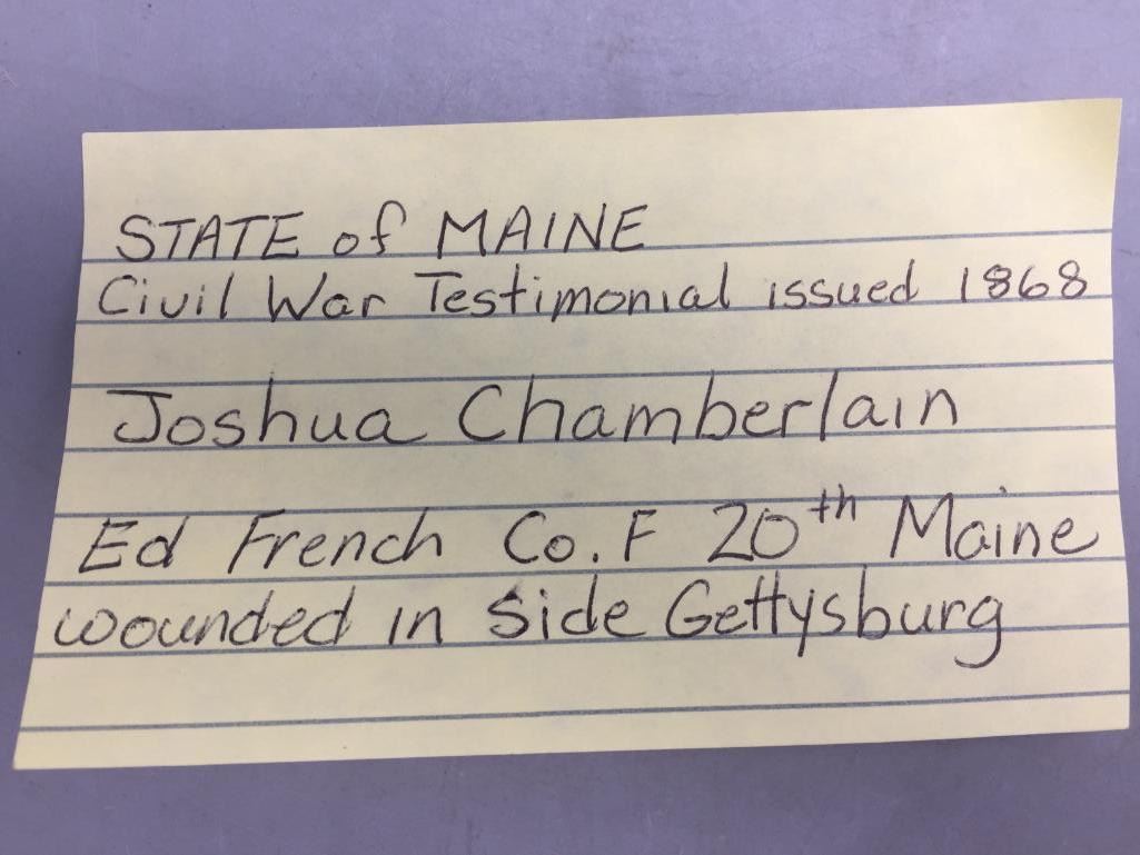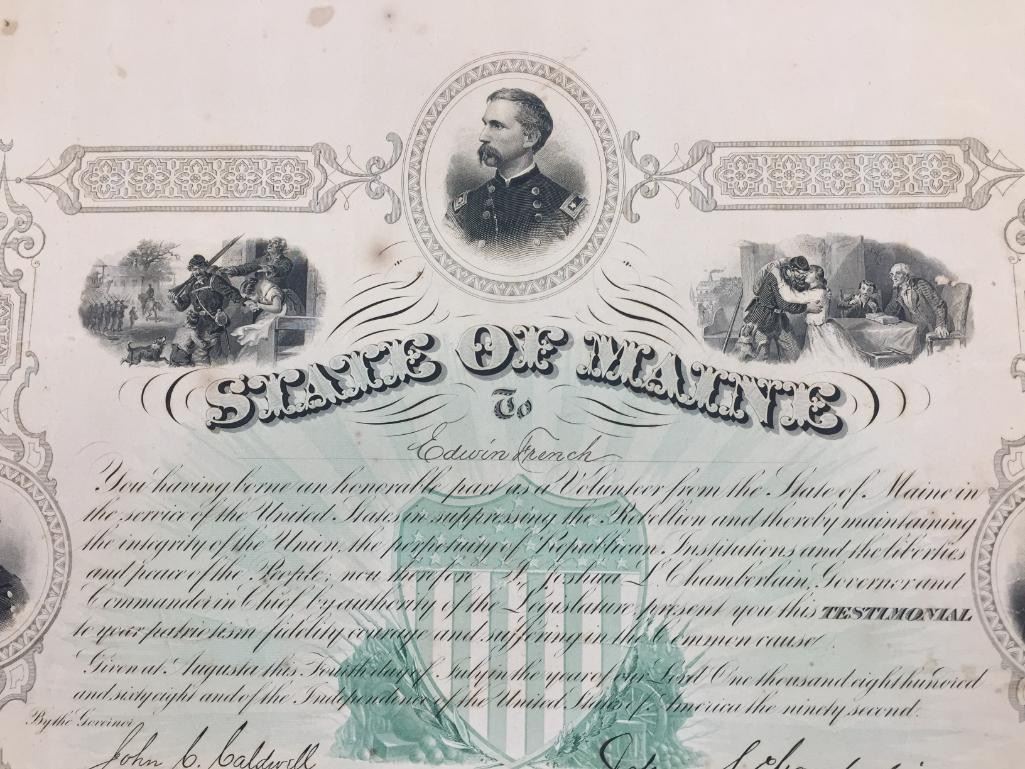 Description: Presented for sale in this lot is a State of Maine, Civil War Testimonial, issued in 1868. This is an original document signed by John Caldwell, Adjutant General and Joshua Chamberlain, Governor. The subject, Edwin French, is believed to be the same Edwin French, Co. F 20th Maine who was wounded at Gettysburg. Maker: American Bank Note Co. New York - Boston is in fine lettering at the bottom. Approx. Age: 1868. Size: 19-1/2 inches wide x 15-1/2 inches tall. Condition: Pretty good for its age, wear, tanning, crumbling expected. Please look closely at the pictures - they are an important part of our description. Shipping: There will be a $10 handling / packaging fee for shipping this lot. The actual cost of postage will be added on top of that.