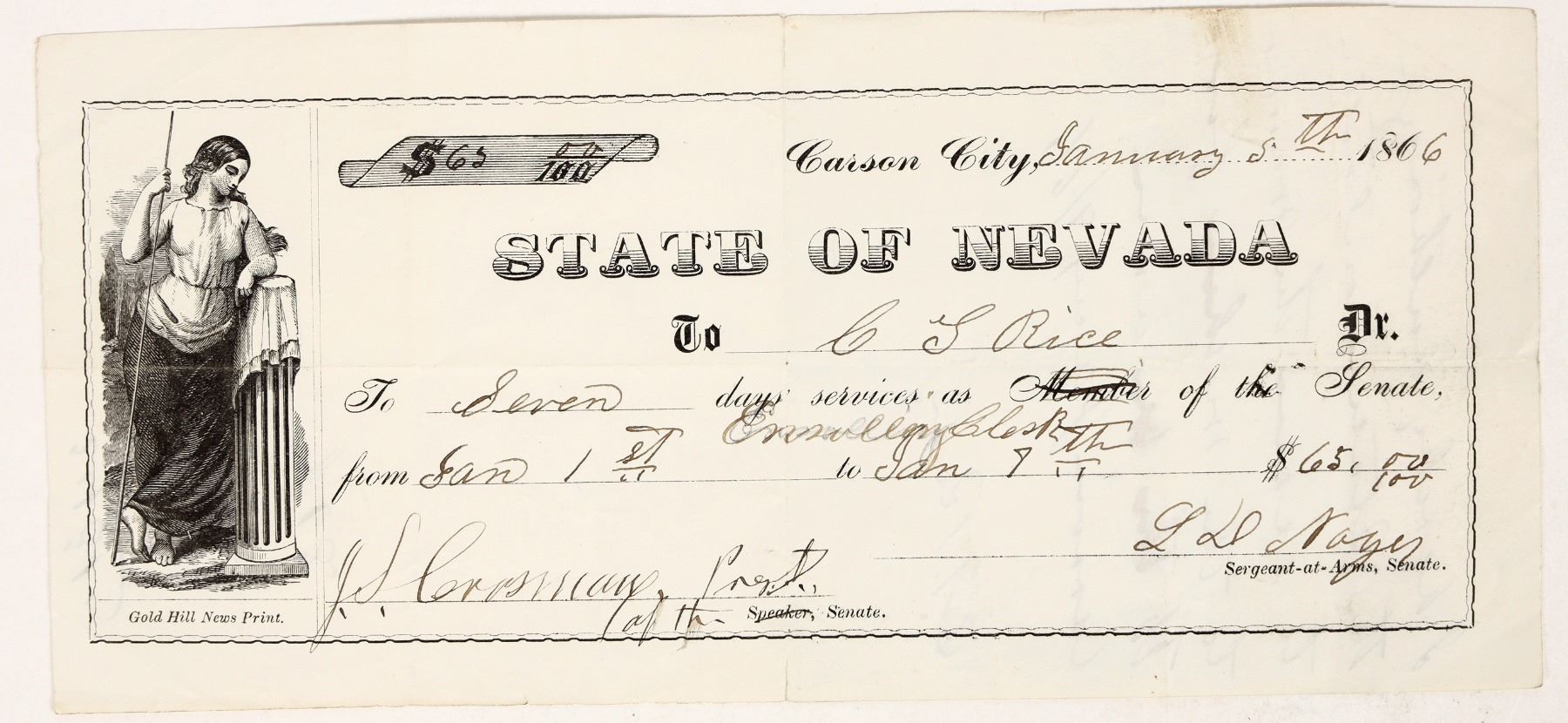 January 5th, 1866 pictorial receipt to CT Rice for 7 days service as Enrolling Clerk for the Senate. Signed by Rice on the reverse. Also signed by Sergeant-at-Arms Noyes and the president of the Senate, JS Crosman. 3.5 x 8" Gold Hill News Print. Clement T. Rice, an important figure in the story of Samuel Clemens becoming Mark Twain, and referred to by Twain as "The Unreliable." Rice, like the Clemens brothers, came to Carson City from the east in the early territorial days. He had hoped to become secretary to Governor Nye, but lost out to Orion Clemens. Rice went to work for the Territorial Enterprise, which at that time was being published in Carson City. Rice lived in the house of Margaret Murphy, along with Samuel Clemens. In 1862, Rice worked for the Virginia City Daily Union while Clemens worked for the Territorial Enterprise, now moved to Virginia City; while the two worked for rival newspapers during the day, they became friends outside of work. They both reported on the Nov. 1862 Territorial Legislature. Clemens was called "reliable" by AJ Marsh and thus he decided to refer to his friend Rice as the "unreliable." In fact, in the February 2nd, 1863 letter to the editor in the Territorial Enterprise where Sam Clemens "became" Mark Twain (by signing the letter with this pen name), Twain describes a party in Carson City where he runs into the "Unreliable." They regularly traded barbs with each other. They also shared an apartment in Virginia City in 1863 and Twain's first trip to San Francisco that year was with Rice. While Twain left Nevada and became a literary celebrity, Rice became Enrolling Clerk in the 1863 Territorial Legislature.