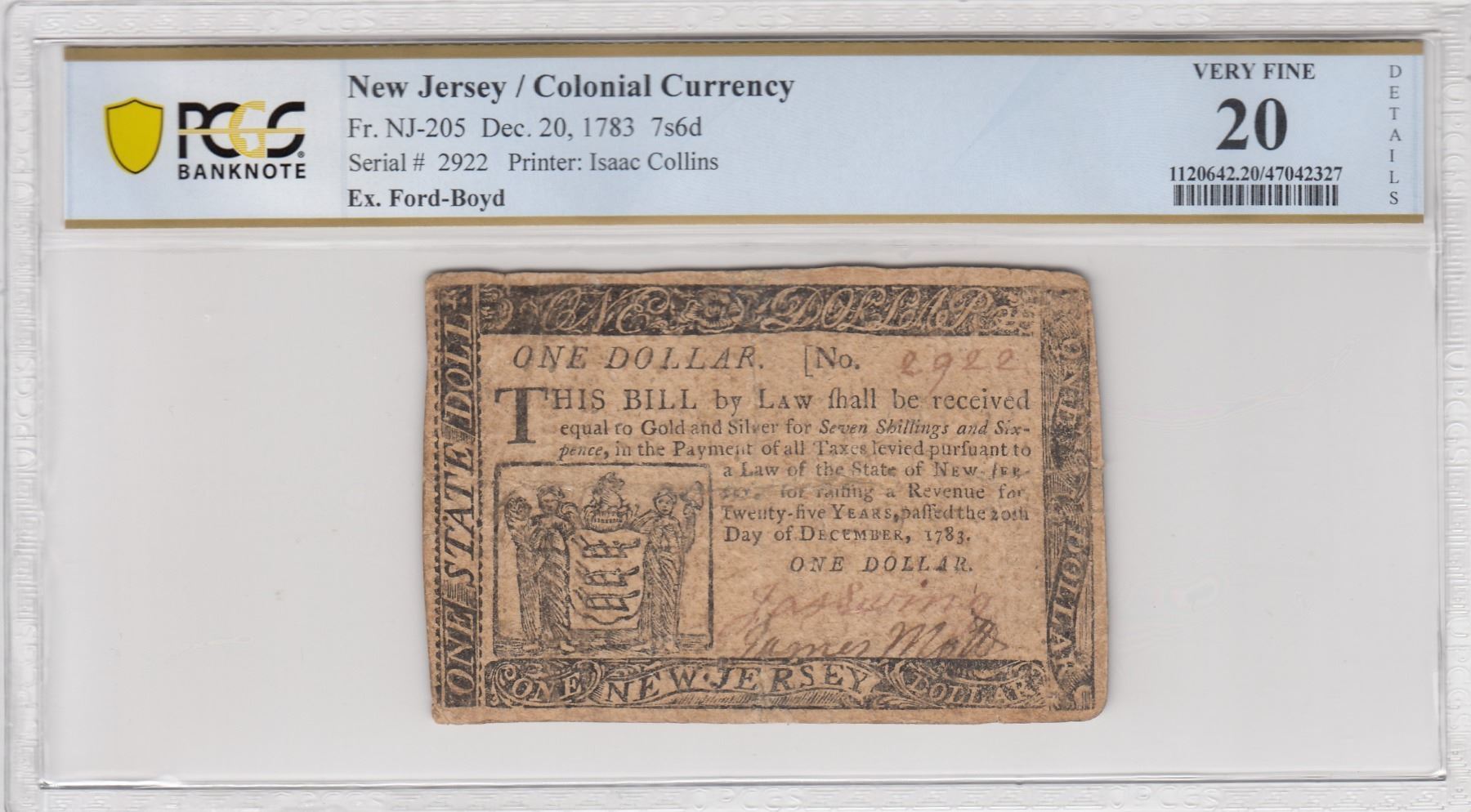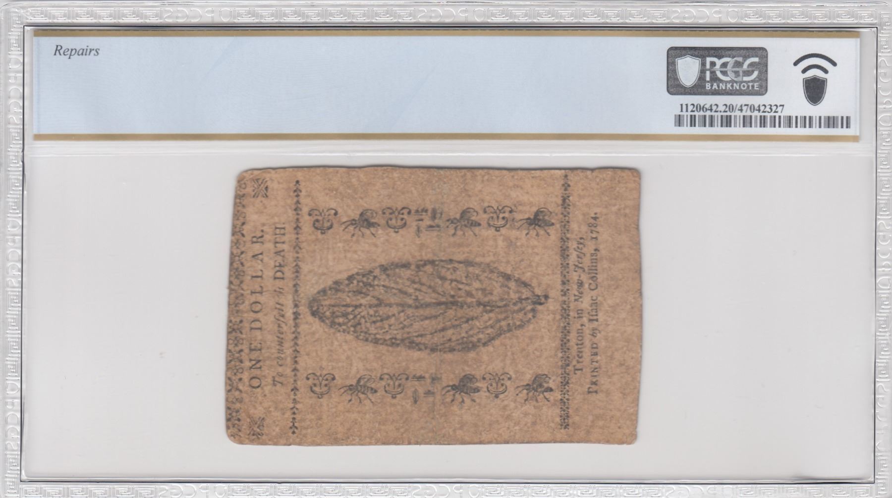 State of New-Jersey. December 20, 1783 Act. One Dollar or Seven Shillings and Six Pence. Fr. NJ-205. PCGS Very Fine-20 Details. Repairs. As illustrated.