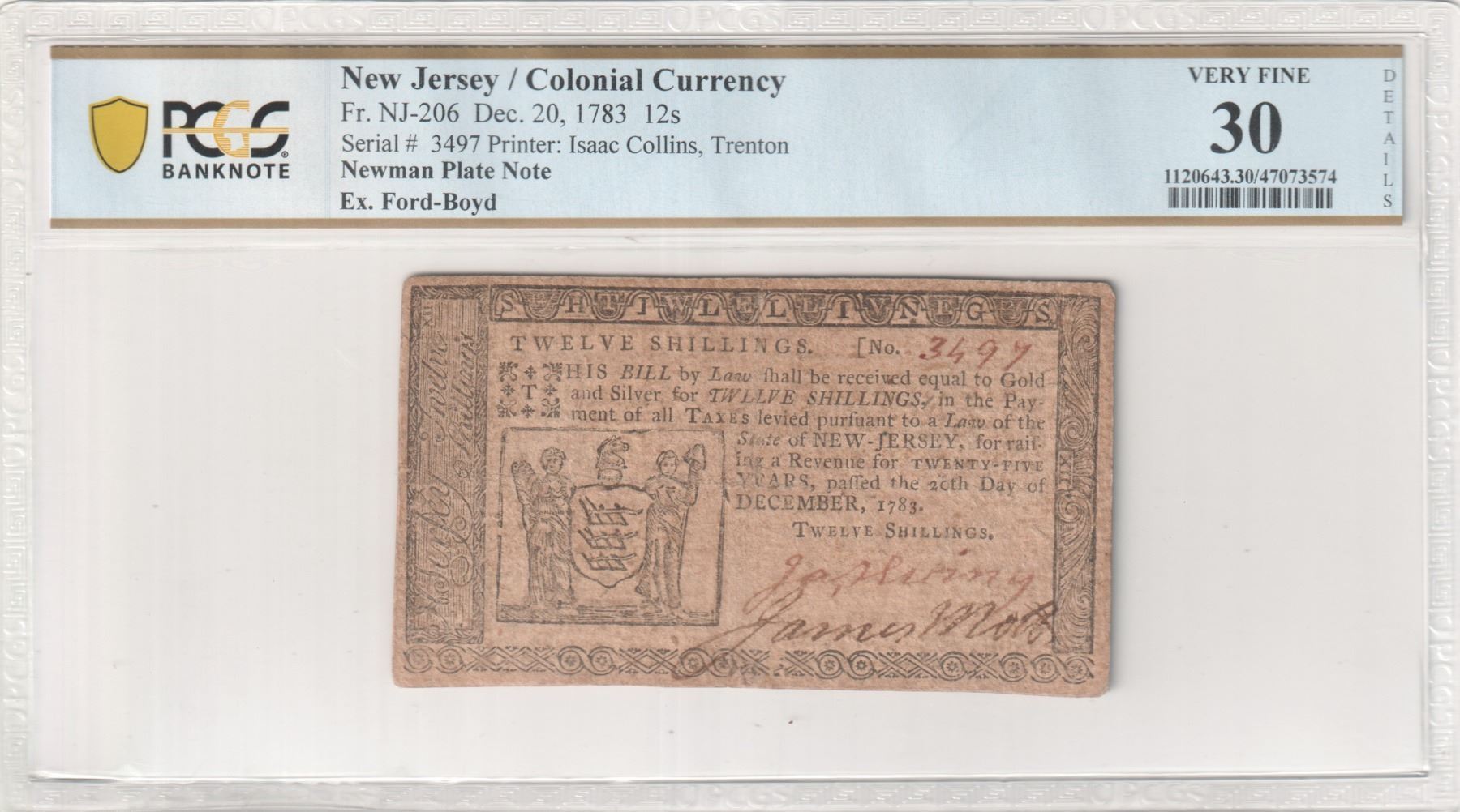 Description: Coarse paper watermarked NEW JERSEY. Serial No. 3497. Signed by Jas. Ewing and James Mott. Two-Sided, black both sides. Leaf back. Printed by Isaac Collins, Trenton. Standard size. Tis Death To Counterfeit. A spectacular note from this rare issue, a note that graced the pages of the Newman reference, and a note with a substantial pedigree as well. This is the first time since the Ford event that this many notes of this issue have been offered anywhere. We have gathered five examples - representing four different denominations - in the present catalog, including a duplicate of this major rarity that immediately follows the present note. Nicely margined with strong details and eye appeal that readily befits a finer grade.