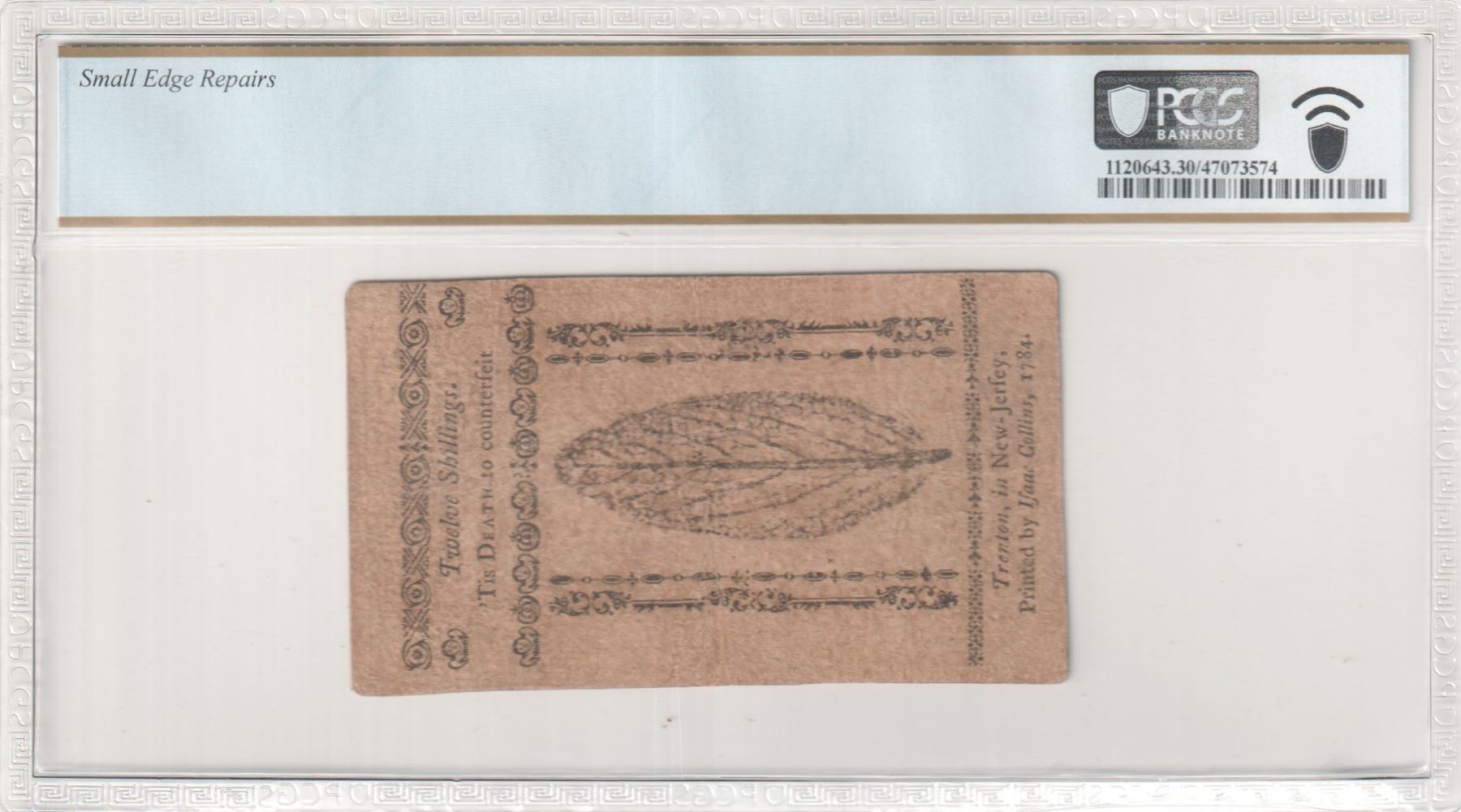 State of New-Jersey. December 20, 1783 Act. Twelve Shillings. Fr. NJ-206. PCGS Very Fine-30 Details. Small Edge Repairs. As illustrated.