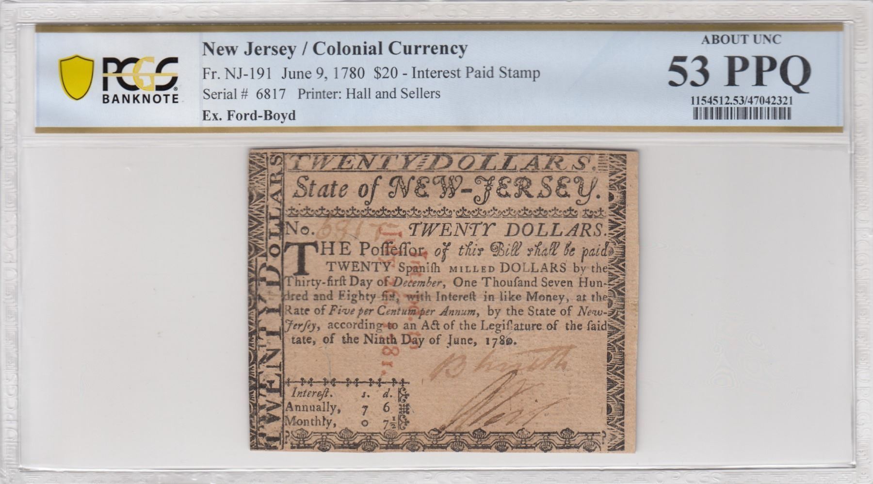 State of New-Jersey. June 9, 1780. Twenty Spanish Milled Dollars. Fr. NJ-191. PCGS About Uncirculate