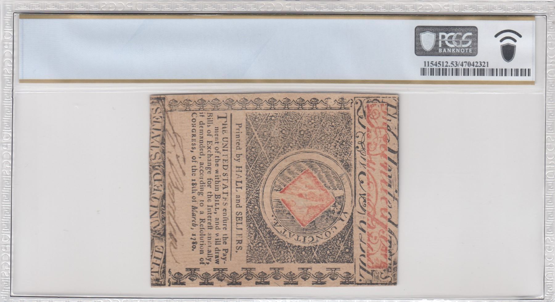 State of New-Jersey. June 9, 1780. Twenty Spanish Milled Dollars. Fr. NJ-191. PCGS About Uncirculated-53 PPQ. No qualifiers. As illustrated.