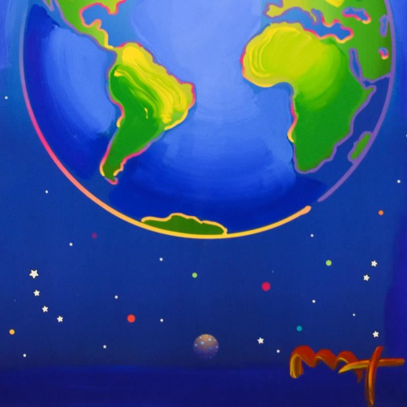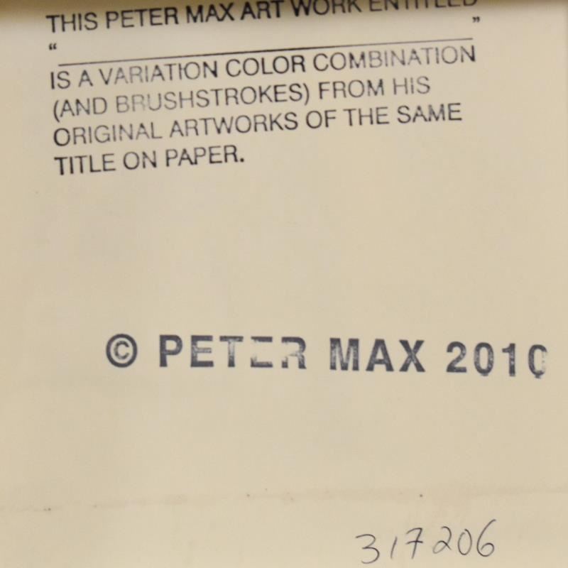 "State of the World Forum" is a one-of-a-kind acrylic mixed media on paper, hand signed by Peter Max. This piece comes custom framed. On the reverse side of this piece there is a registration number (317206) from Peter Max Studios certifying authenticity. Measures approx. 46.5" x 34.5" (with frame), 35" x 23" (image).