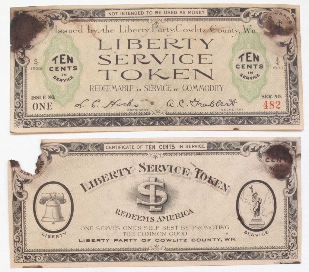 LIBERTY SERVICE NUMISMATIC TOKENS, WASHINGTON STATE, 1933: This lot of 2 Liberty Service Tokens issued by the Liberty Party, Cowlitz, Washington, during the Depression of 1933. They are #471, and # 482, both for 10c, the 471 has a dark water stain and missing upper R/H corner piece. #482 has dark water stain on the upper R/H & L/H corners.City: County: State: WA