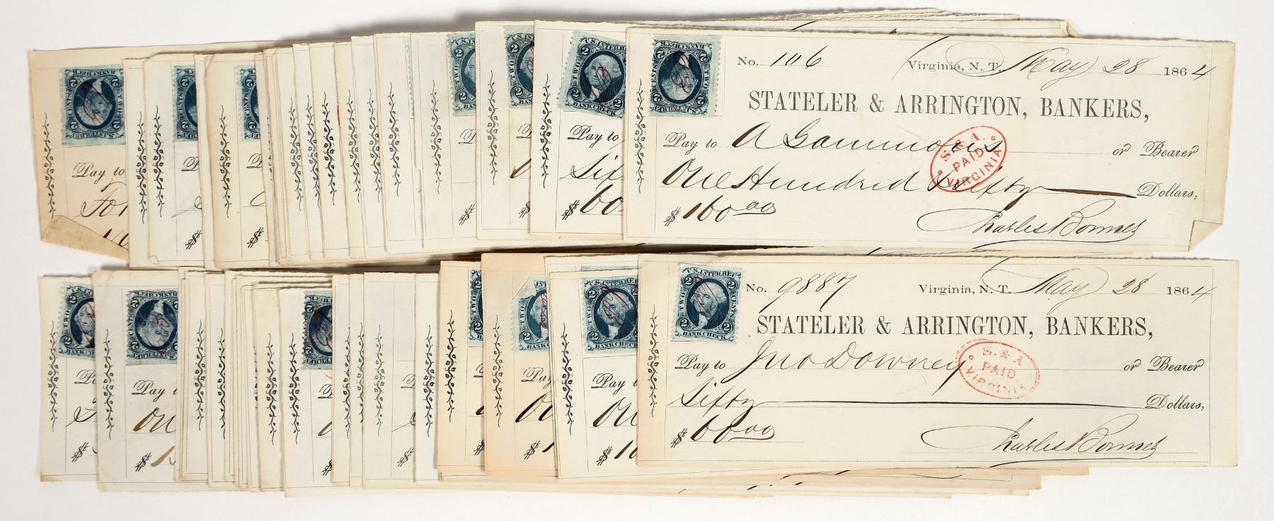 Lot of 50 Stateler & Arrington checks issued in 1864 by Charles Bonner for the Gould & Curry Mine. Bonner had taken over for Charles Strong after his mismanagement of the company's mill. All of these checks have red bank cancels, which is less common. Likely issued to mine or mill workers.