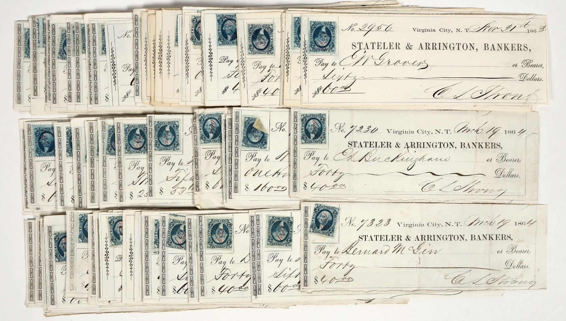 Lot of 100 Stateler & Arrington checks issued in 1863-64 by the Gould & Curry Mine, likely to pay mill or mine workers. Signed by either Charles Strong or Charles Bonner as superintendent. Bonner replaced Strong due to unhappiness with Strong's management of the very expensive Gould & Curry Mill. Most have a US IR stamp. Excellent archive!