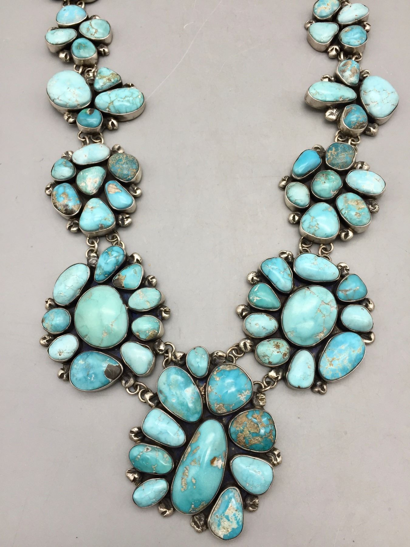 Description: For your consideration is this gorgeous, statement piece kind of turquoise necklace! This piece has gorgeous, graduating turquoise clusters surrounded by hand crafted sterling silver details. Maker: Hallmarked Kathleen with a symbol that looks similar to a “C”. (Someone has written on the back Kathleen Chiquito, Navajo, however we were unable to verify that hallmark). Approx. Age: Fairly Contemporary. Size: Fits a 26” neck. Main pendant measures 2-3/8”w x 2-3/4” tall. Weighs approximately 333.3 grams. Condition: Good for its age, normal wear expected. Please look closely at the pictures - they are an important part of our description. Shipping: There will be a $5 handling / packaging fee for shipping this lot. The actual cost of postage will be added on top of that.