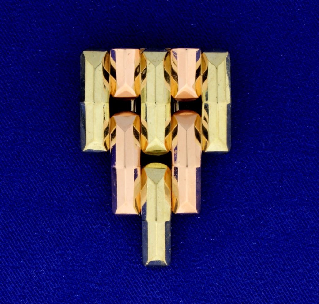 In 14K rose, white , & yellow gold, this pin is 1 3/4 inches long and matches necklace & earrings in previous lots. 17.4g