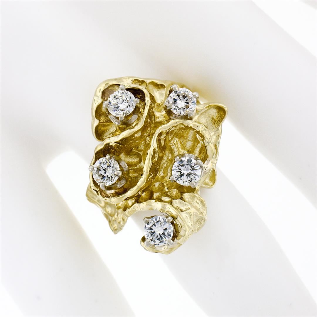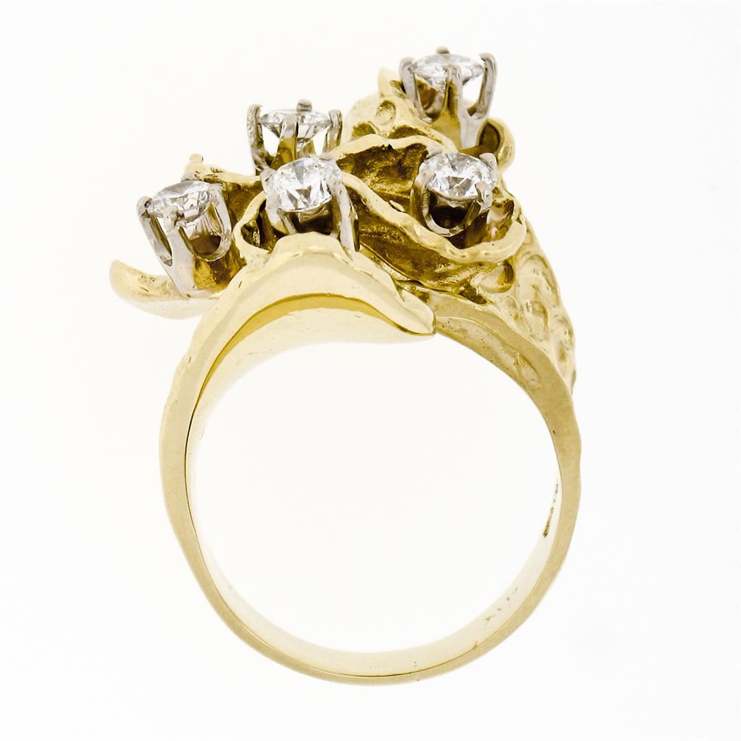 A vintage solid 18k yellow gold cocktail ring, with 5 round brilliant cut natural diamonds (G/H - VS1/VS2 ; 1.03ctw). The ring is size 7.5, weighs a total of 13.76 grams, and measures 23.0mm wide.