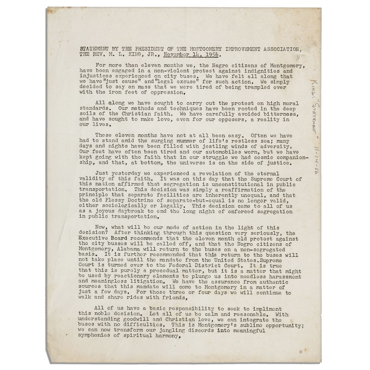 Montgomery Improvement Association's printed statement, dated 14 November 1956 and written in response to the Supreme Court declaring segregation unconstitutional in response to the Montgomery Bus Boycott. Reads in part: ''...the Supreme Court of this nation affirmed that segregation is unconstitutional in public transportation...This decision came to all of us as a joyous daybreak to end the long night of enforced segregation...All of us have a basic responsibility to seek to implement this noble decision. Let all of us be calm and reasonable...'' One page typed document measures 8.5'' x 11''. Minor toning and foxing and a pencil notation ''King's Statement'' along right edge. Very good. From the collection of Maude Ballou, Martin Luther King Jr.'s close friend and personal secretary.