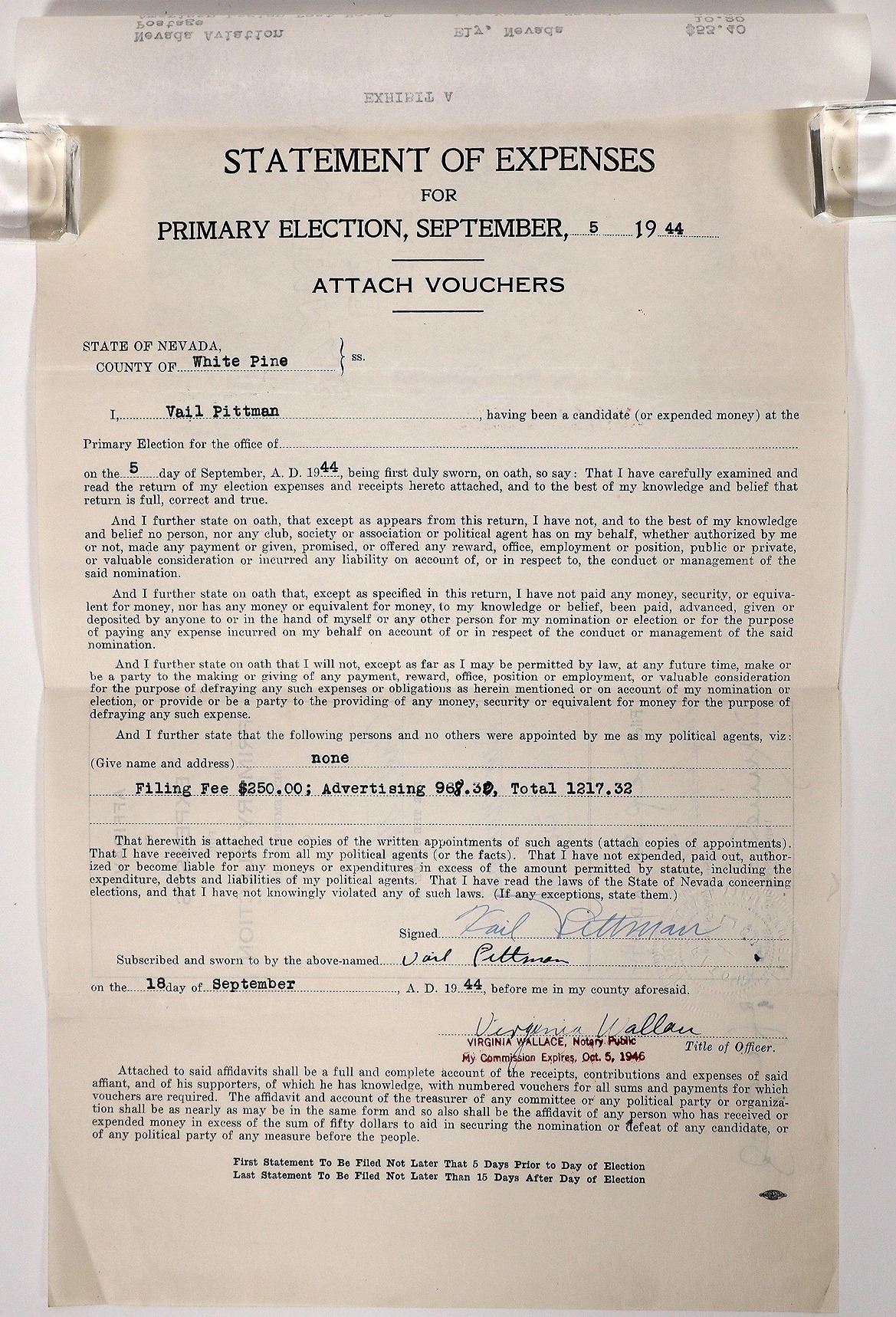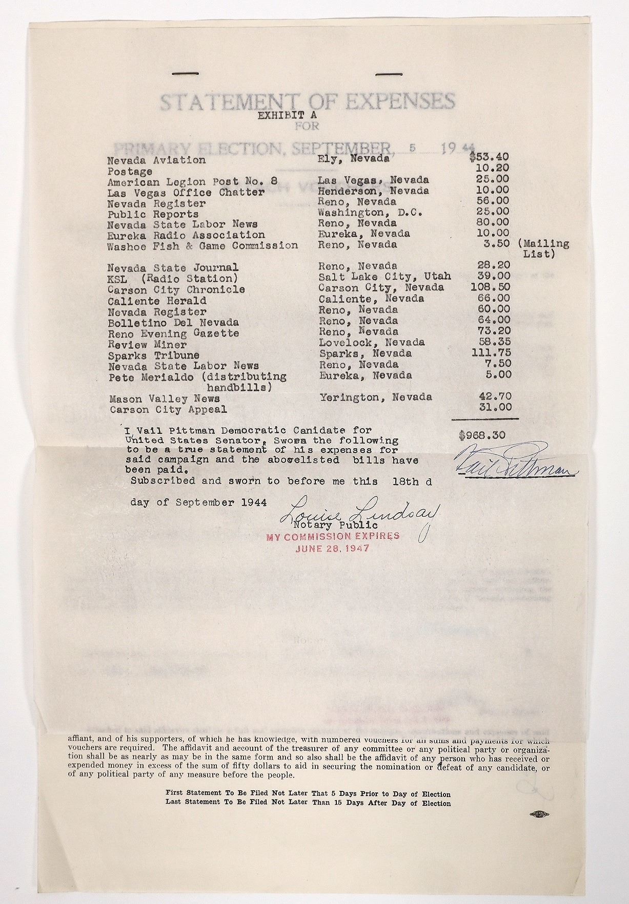 Statement of Expenses for Primary Election, September 5th, 1944. For democratic senate candidate Vail Pittman. Pat McCarran ending up winning this election, but Pittman became the 19th governor of Nevada in 1945. Previously, he worked in coal and mining interests in Tonopah and newspapers in Ely, Nevada. Two documents attached to each other.