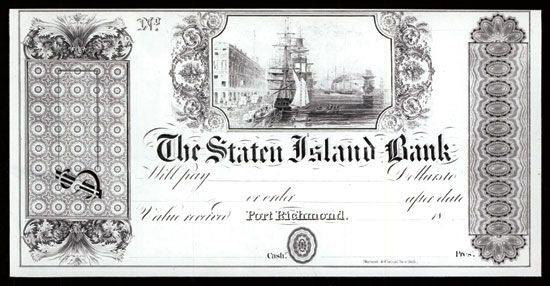 Port Richmond, New York, 18xx (originally printed in 1838-46, these are ca.1960-70's), $-Odd Post Note, (Similar to NY-22-55- Unlisted without denomination), Modern ÒProprietary ProofÓ, Middle top has sailing ship at dock in busy harbor and street scene, Black printing with no underprint printed on thin white card, CU to Gem Uncirculated condition. Durand & Co. Rare note in any format. (ABN Commemoratives, AIA XI, May 15, 2012)