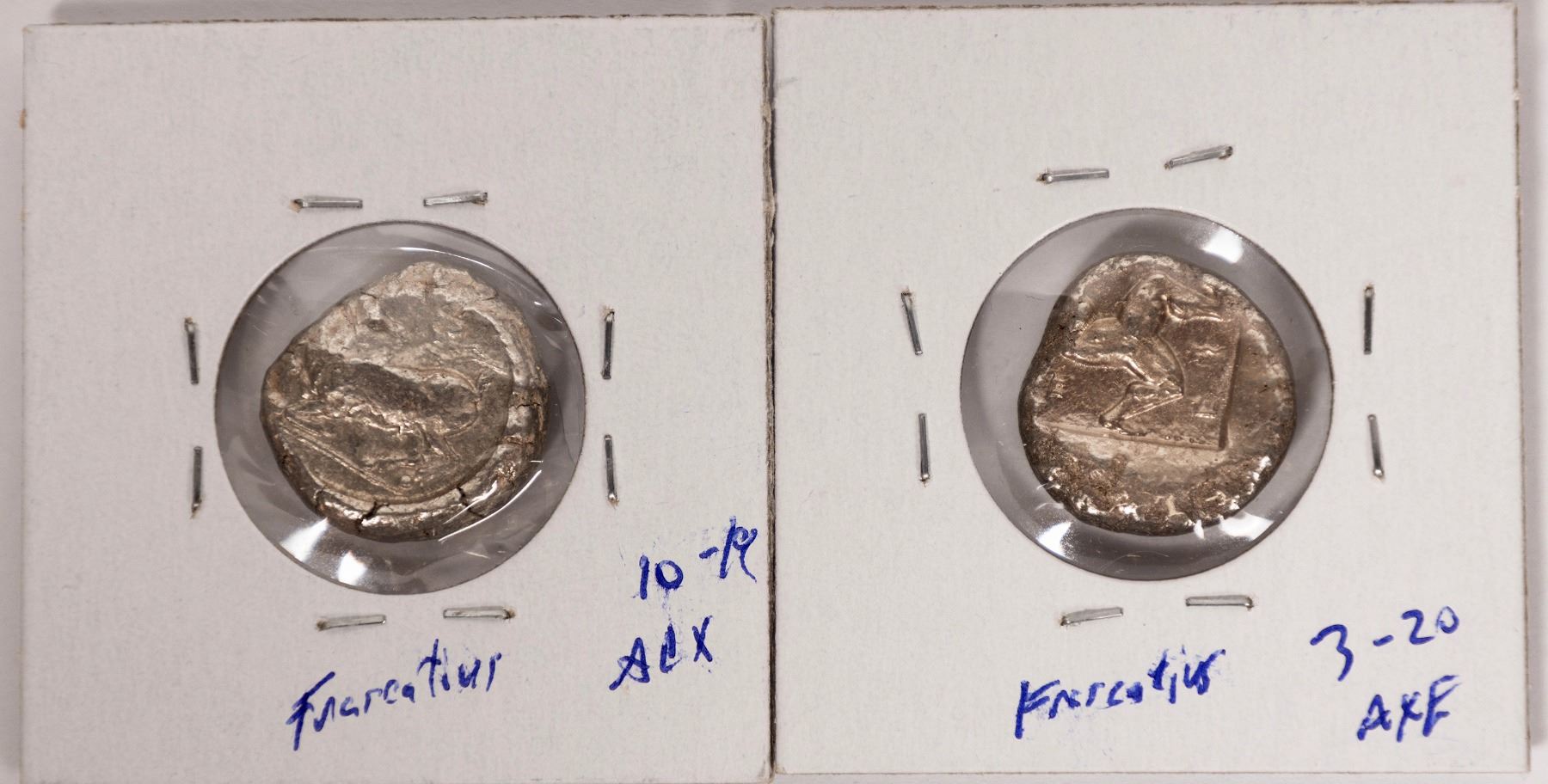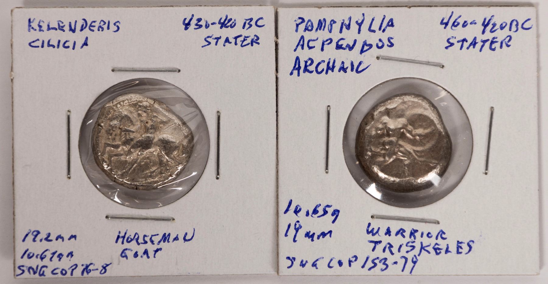 Two archaic staters of Aspendos and Kelendris. Worn and polished with reverse off center, but images clear. Aspendos, warrior with shield and spear and Triskeles reverse; 10.65 gr., 19 mm. Kelendris with horse, man and goat; 19 mm; 10.6 gr. Nice budget examples.