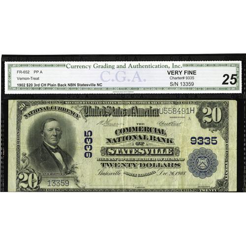 <B>Statesville, NC</B></I> - $20 1902 Plain Back Fr. 652 <B>The Commercial NB </B></I> Ch. # 9335<BR>This example brings the total notes known from here to nine large. By far this has to be the finest on the bank. Though a bit tight at the bottom it has garnered a grade of <B>Very Fine 25</B></I> from CGA.