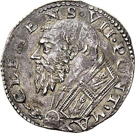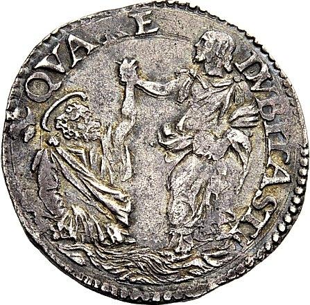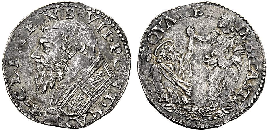 Stato pontificio. Clemente VII (Giulio de’Medici), 1523-1534. Doppio carlino. AR 5,25g. Busto a s., con piviale ornato. Rv. QVA RE DVBITASTI Gesù solleva S. Pietro dalle acque; nel giro a s., segno dello zecchiere Giacomo Balducci. CNI 58. Muntoni 43 var.I. Berman 841. Bella patina di medagliere, BB
