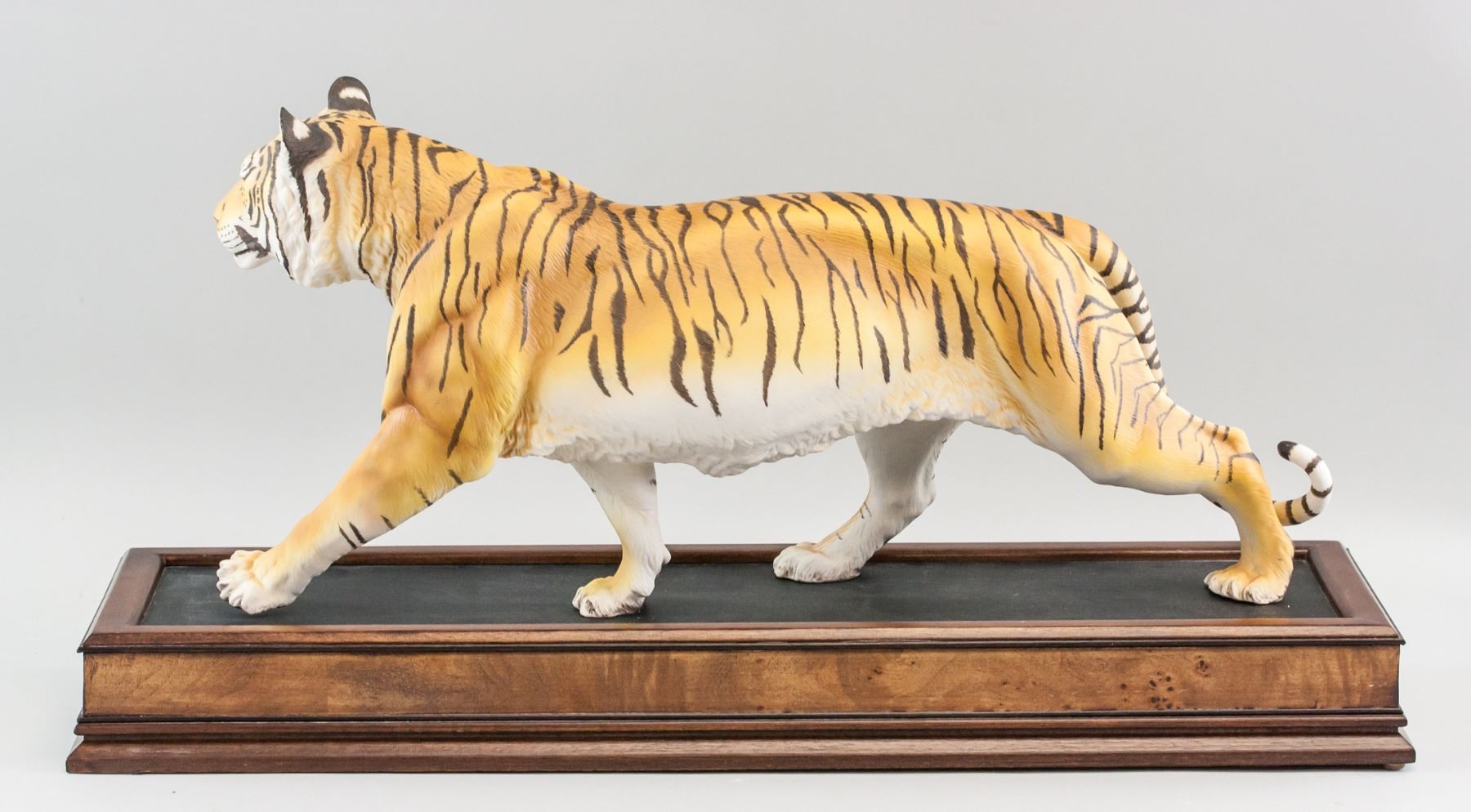 Porcelain statue. Of prowling tiger, with stand. "HAND-PAINTED PORCELAIN THE FRANKLIN MINT / ON THE PROWL" stamped on vase. 27 x 54 cm, Stand: 64 x 21 cm, 3 kg total.