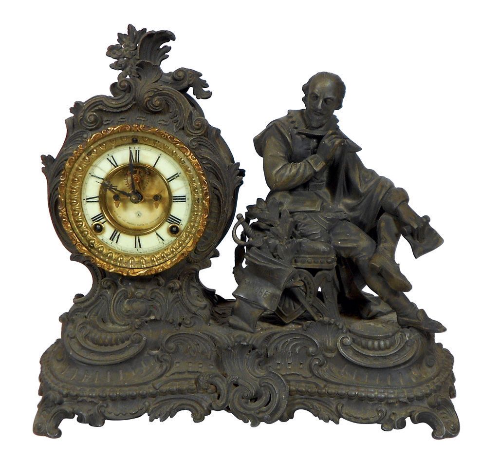 Statue clock, Macbeth writing Hamlet, porcelain dial marked The Ansonia Clock Co.-NY, fancy cast iro