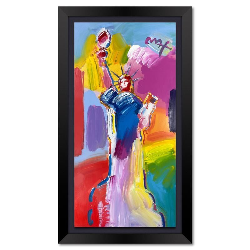 "Statue of Liberty" is a one-of-a-kind acrylic mixed media on paper, hand signed by Peter Max. On the reverse side of this piece there is a registration number from Peter Max Studios certifying authenticity. This piece comes custom framed. Measures approx. 45" x 25.5" (frame), 39" x 19.5" (image).