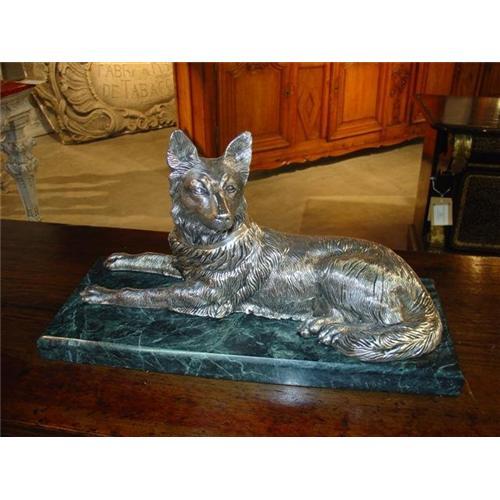 This is a Statue of a Small Dog with Collar in Silvered Metal on Green Marble Base ? Excellent Condition. Please contact us for more photos. Not Antique!