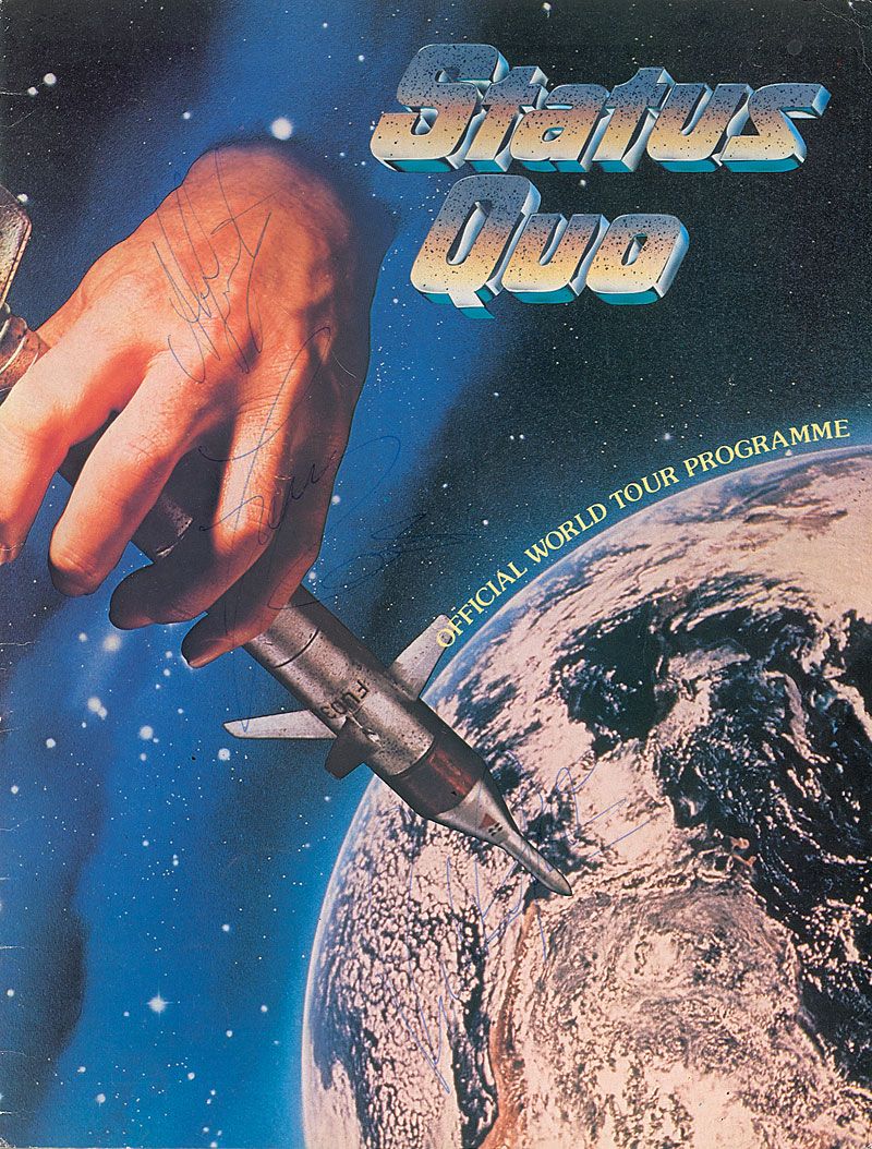 Status Quo’s 1981 World Tour program, 9.5 x 12.25, signed on the front cover in blue ballpoint by Francis Rossi, Alan Lancaster, and Richard Parfitt. Light to moderate contrast to all three signatures, otherwise fine condition. Accompanied by a full letter of authenticity from Roger Epperson/REAL.