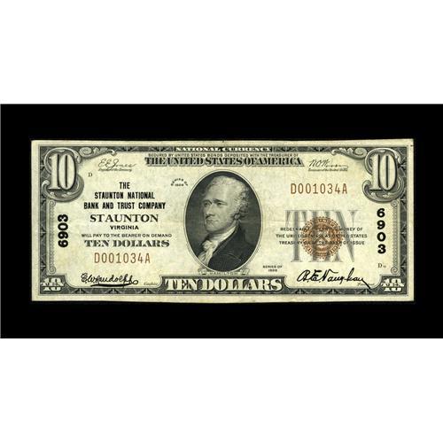 <B>Staunton, VA</B></I> - $10 1929 Ty. 1 <B>The Staunton NB & TC</B></I> Ch. # 6903<BR>This is just as tough a bank to find in small size as large, with the census for each coming in at ten pieces or less. Most of the small notes we've seen from here are very well circulated or flawed in some manner. This example, grading a bright <B>Very Fine,</B></I> is a happy exception.<BR><I>From The George P. Hammerly Collection</B></I><BR><BR><b>Shipping:</b> Coin/Currency (<a target="_blank" href="http://www.heritageauctions.com/common/shipping.php">view shipping information</a>)