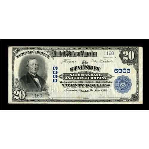 <B>Staunton, VA</B></I> - $20 1902 Plain Back Fr. 650 <B>The Staunton NB & TC</B></I> Ch. # 6903<BR>This is one of a scant 2 large with this bank title. The signatures are partly visible. <B>Very Fine.</B></I><BR><BR><b>Shipping:</b> Coin/Currency (<a target="_blank" href="http://www.heritageauctions.com/common/shipping.php">view shipping information</a>)
