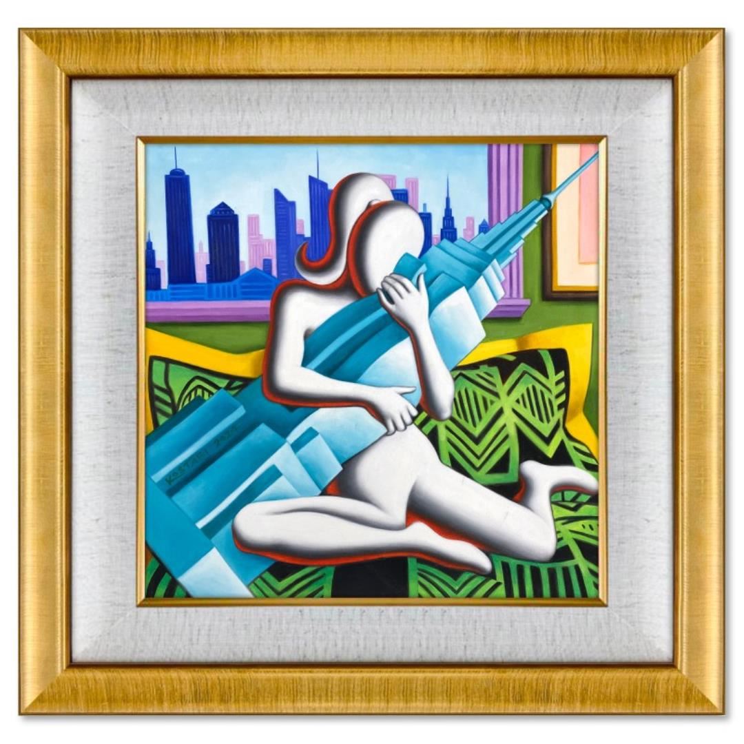 "Stay with Me" is an original oil painting on canvas by Mark Kostabi, hand signed by the artist. This piece comes custom framed. Includes Certificate of Authenticity. Measures approx. 30" x 30" (frame), 20" x 20" (image).