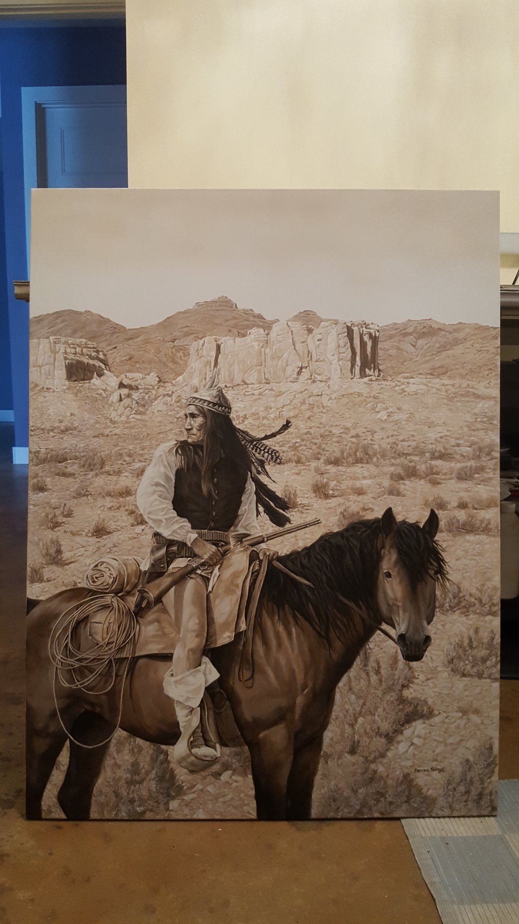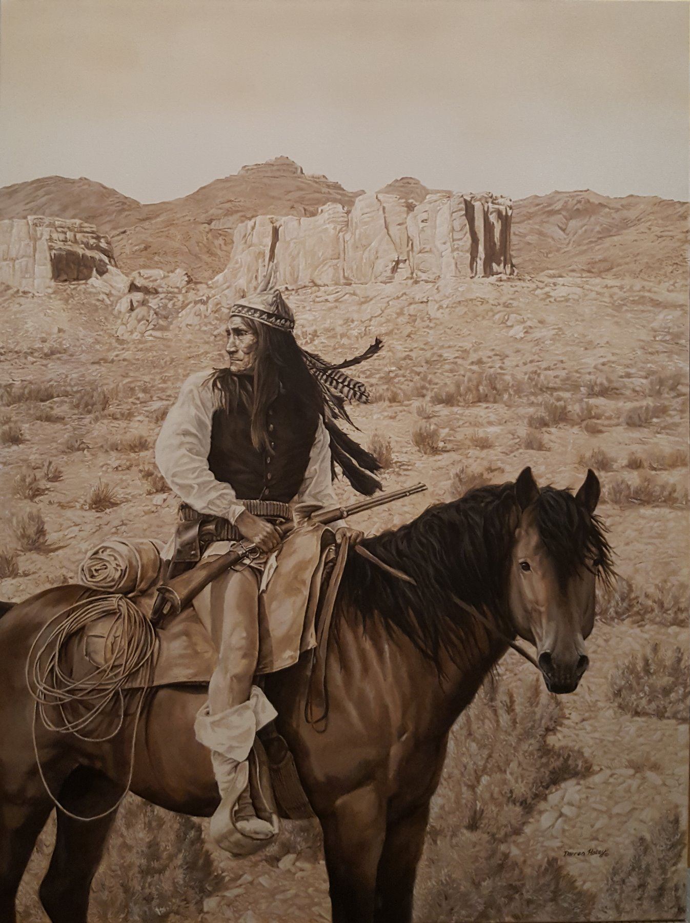 Artist: Darren Haley. Title: Staying Ahead of the 4th Cavalry. Artwork size: 40" x 30". Frame: unframed gallery wrap. Medium: Acylic on canvas. Artist's description: I wanted to capture Geronimo while still free...but imagine him constantly looking for the US 4th Cavalry.