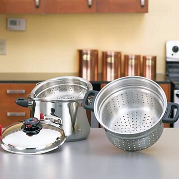 Steam Control 8qt T304 Stainless Steel Stockpot/Spaghet **|**|** Excellent for pasta, seafood, soups, stews, and rice; this multi-cooker boils, steams and blanches. Simply lift out the deep pasta insert after the pasta has cooked. No need to pour hot water into a separate colander. This is much easier and safer. Set includes: 8qt stockpot, cover with Steam Control top knob, pasta colander, deep fry basket, and 4-3/8" steamer basket. All 3 inserts can be used alone in the 8qt stockpot or the pasta insert & steamer basket can be used at the same time. All pieces store together inside stockpot. Limited lifetime warranty.