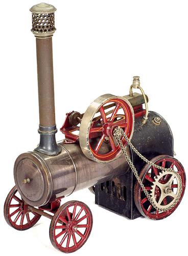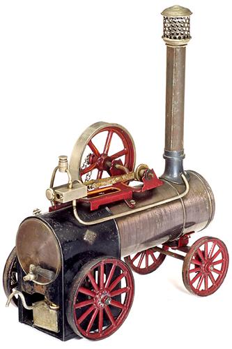 Fahrbare Dampflokomobile "Bing", um 1912 Modell Nr. 130/732, mit Sicherungsventil und Ablaßhahn, feststehender Zylinder, Kessellänge 20 cm, Ø 6 cm, massive Räder, gut erhaltener Originalzustand, komplett mit allen Beschlägen und Brenner. - Sehr interessantes Stück!