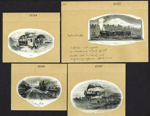 Steam locomotive views. One a special with State of California, McCloud River Railroad; Another Penn R.R. by Western BNC. Other two show locomotive cab interior view as well as train massing track crew. India paper proofs mounted onto ABNC die file folders, now cut down. V37717, V37707, V38335, V37718 are the die numbers. Slight glue tone or paper tears before mounting. 4 pieces.