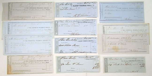 Rhode Island, 1853-60. Lot of Steamboat Transportation & Wharfage Receipts, Includes: 7 Commercial Steamboat Company payment slips and 5 Wharfage receipts. Items are in VF-XF condition. (12). Sold "AS IS" no returns accepted.