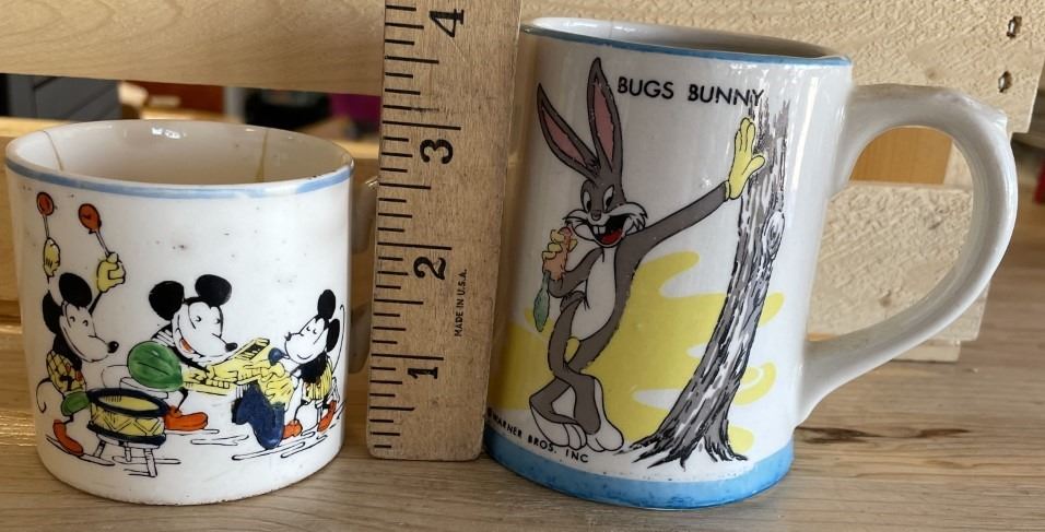 As is, has been repaired. Both cups were made in Japan. The Steamboat Willie Cup has cracks filled with a golden substance. The Mickey Mouse Cup is very rare, not found in an image search. We think it is circa 1930s because there is a tea set made in Japan at that time with the same Mickey Mouse style.