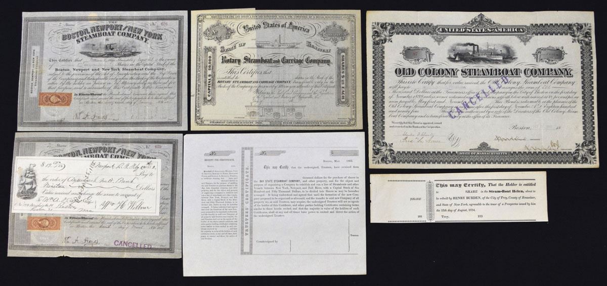 Various States, ca.1830-80s. Lot of 6 issued certificates and related documents, highlights include: Boston, Newport & New York Steamboat Company; Old Colony Steamboat Company; Rotary Steamboat and Carriage Company; Bay State Steamboat Company; and a share certificate for the Steamboat Helen. Condition ranges Fine to VF with typical folds, cancellations, and edge wear. (6). Sold “AS IS” no returns accepted.