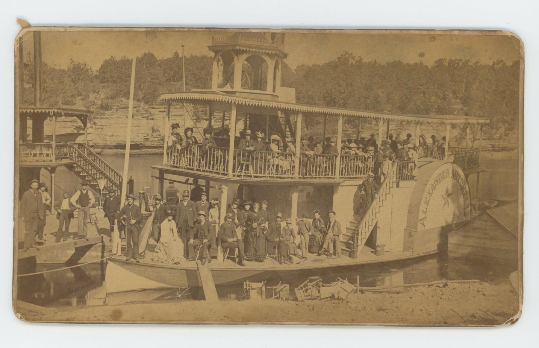 Photographer Henry Hamilton Bennett. Wisconsin Dells. Steamboat Alexander Mitchell with passengers posing on board. Man with harp on bow. Edge of "Dell Queen" on left.