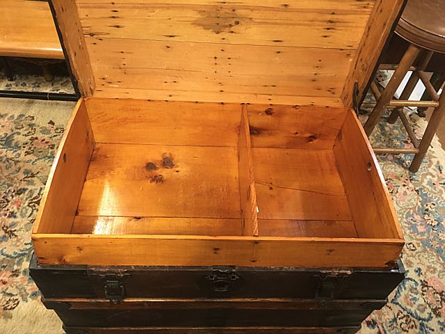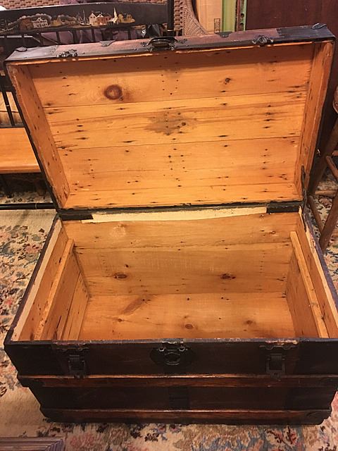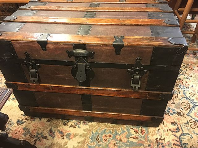 Nice flat top steamer trunk, nicely refurbished and clean with original wood till, nice harware and canvas.