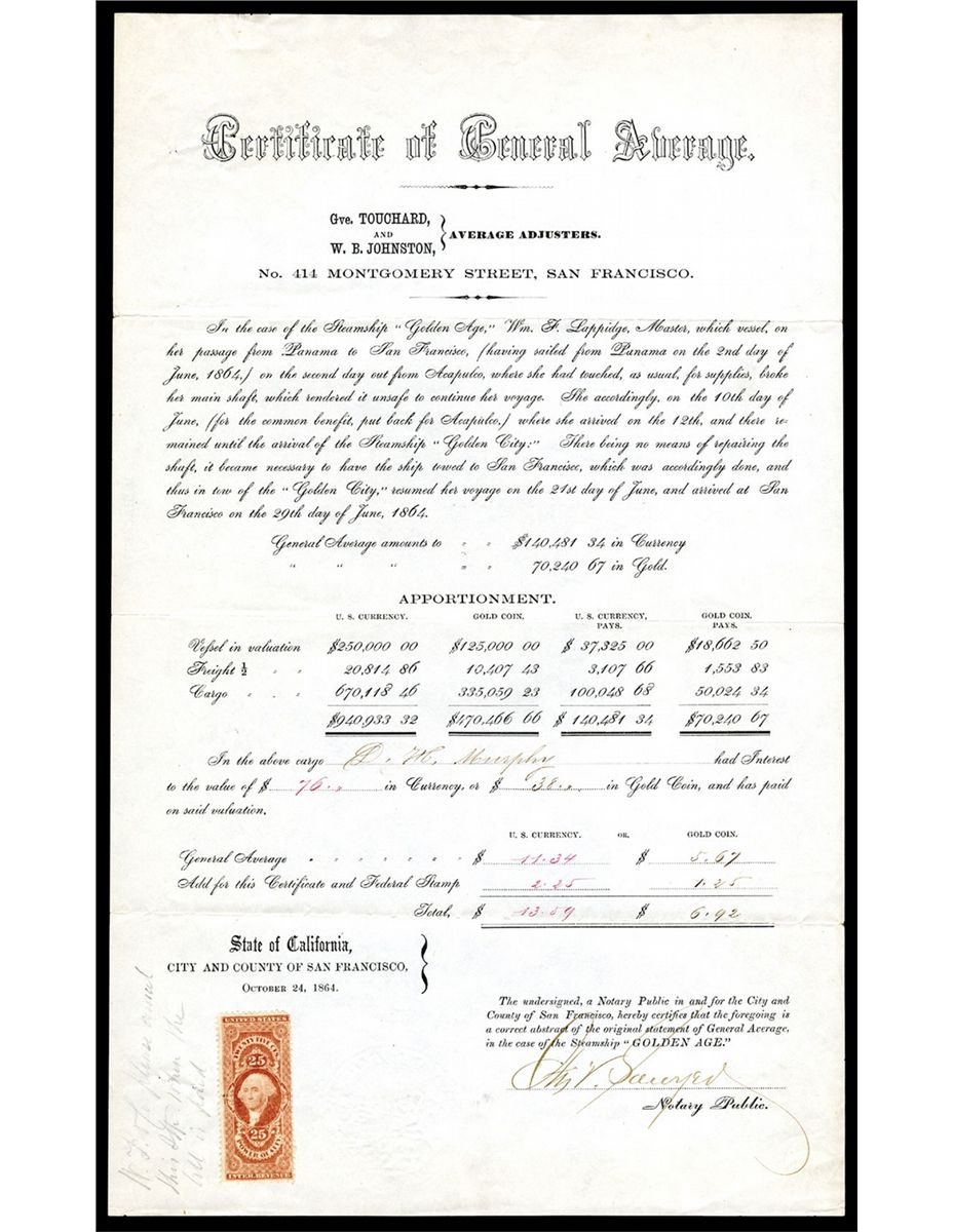 San Francisco, California. Certificate of General Average, 1864, signed by a Notary Public, relating to gold coin and US currency and the Steamship "Golden Age". Carries a 25c revenue stamp. Measures 13.5" by 8". Excellent condition. The steamship "Golden Age", "...having sailed out of Panama and the second day out from Acapulco, broke her main shaft, which rendered it unsafe to continue her voyage.... towed to San Francisco". It appears that either a 15% charge was placed on the value of the cargo, currency and coins it carried and evidently charged to the company or it represents an interest that the second boat earned by taking the cargo the rest of the journey. Interesting and extremely rare Wells, Fargo related document. First time seen by cataloger.
