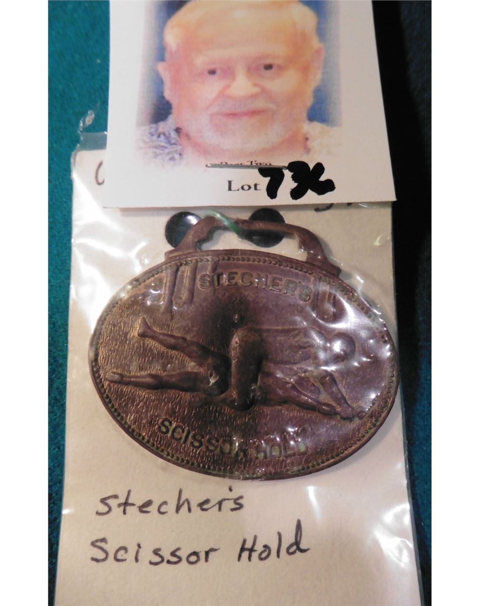 “Stecher's Scissor Hold” Brass Watch fob. Depicts a wrestling movement between a pair of wrestlers.