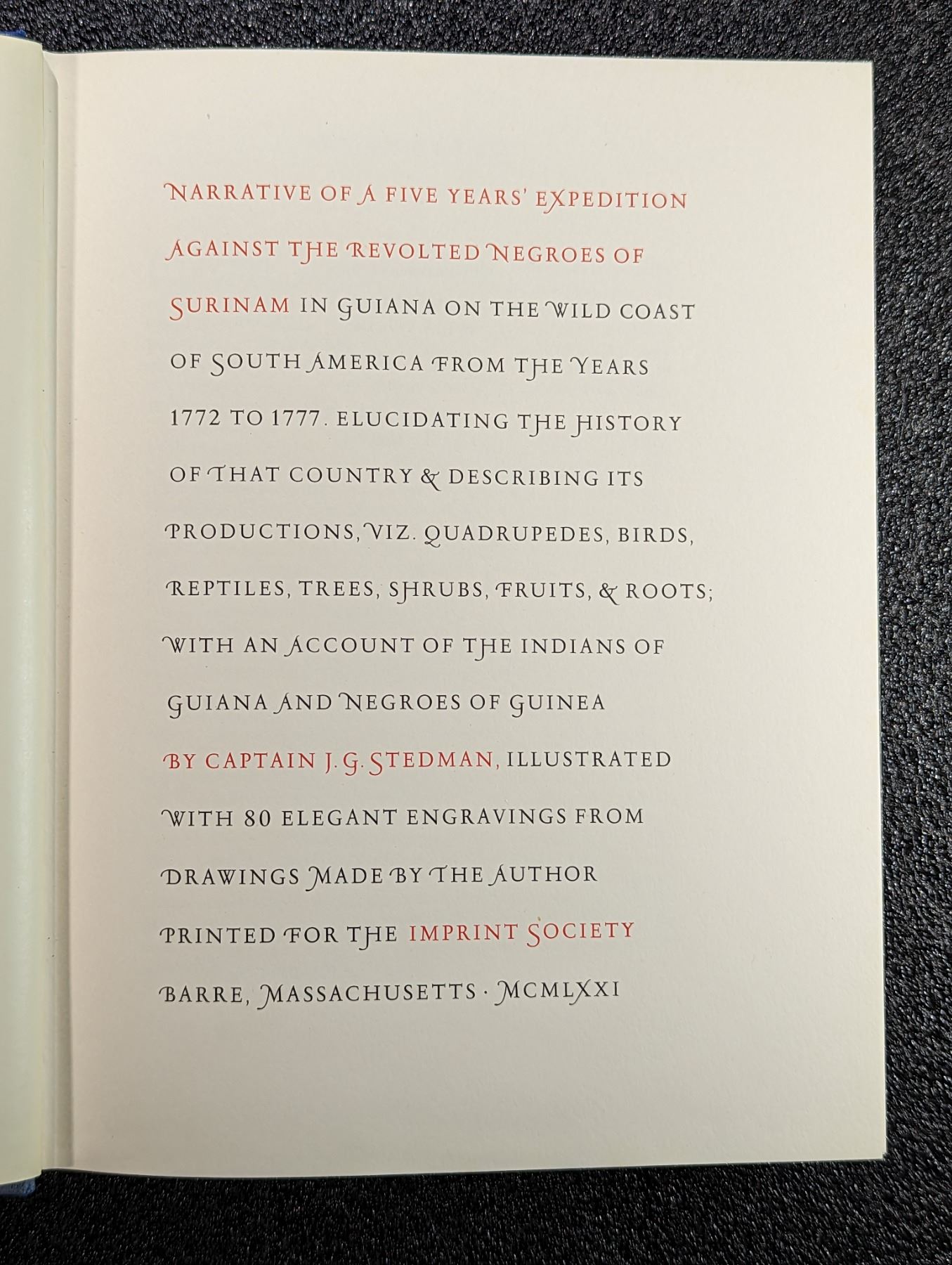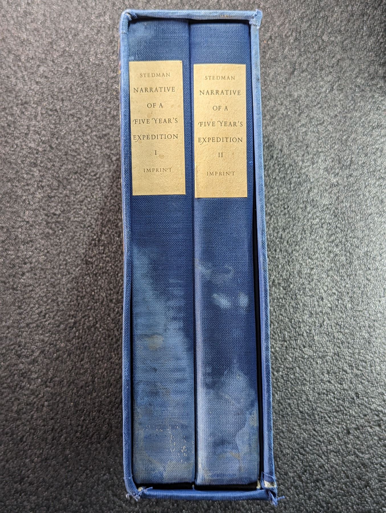 Stedman, Capt. John Gabriel. NARRATIVE OF A FIVE YEAR'S EXPEDITION. VOLUMES I & II. The Imprint Society, Barre. 1971. 4to. (2), xxviii, 486, (2) pages. Matching original blue cloth over French marbled papers, cream title plate, slipcase. 80 half-tone engraving plates from the author's drawings. All the original copperplate line and aquatint engravings have been photographed direct from the originals and reproduced by offset-lithography. English text. Cover cloth on books/slipcase bleached out or stained in places, overall Very Good. This book relates the author's narrative of a five year expedition against the revolting peoples of Surinam in Guiana on the coast of South America from the years 1772 to 1777. Elucidating the history of that country and describing its productions, viz. quadrupeds, birds, reptiles, trees, shrubs, fruits, and roots; with an account of the indians of Guiana and other peoples of Guiana. Lot weight: 7 lbs 6oz. Subject(s): Surinam History.