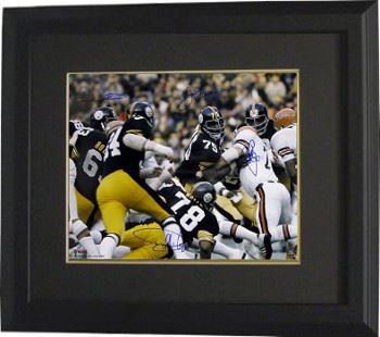The Steel Curtain was the nickname given to the front four of the famous defensive line of the Pittsburgh Steelers during their 1970s dynasty years. This defense was the backbone of the Steelers dynasty, which won 4 Super Bowls (IX, X, XIII, and XIV). This is a hand autographed Pittsburgh Steelers Steel Curtain 16x20 Photo. 4 Autographs include: Joe Greene, Dwight White (deceased), Ernie Holmes (deceased), and LC Greenwood. Certificate of Authenticity from Athlon Sports. Custom Black Mat and Premium Black Color Framed as shown.