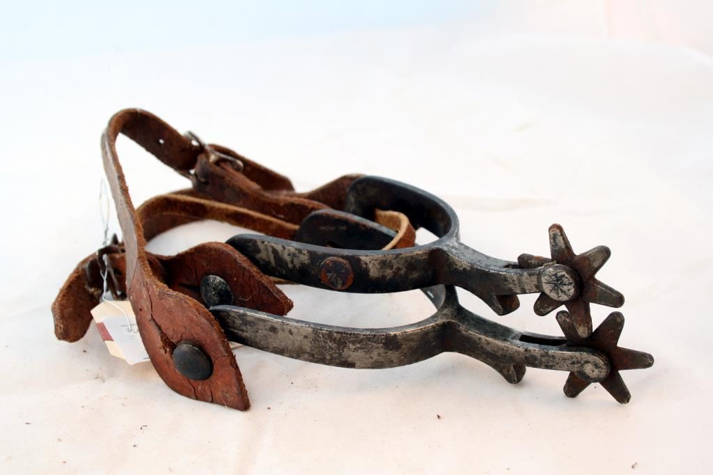 Steel McChesney Spurs, single mounted 2 1/8 shanks 1 3/8 six point spoke rowels. The straps appear to be original to the spurs.