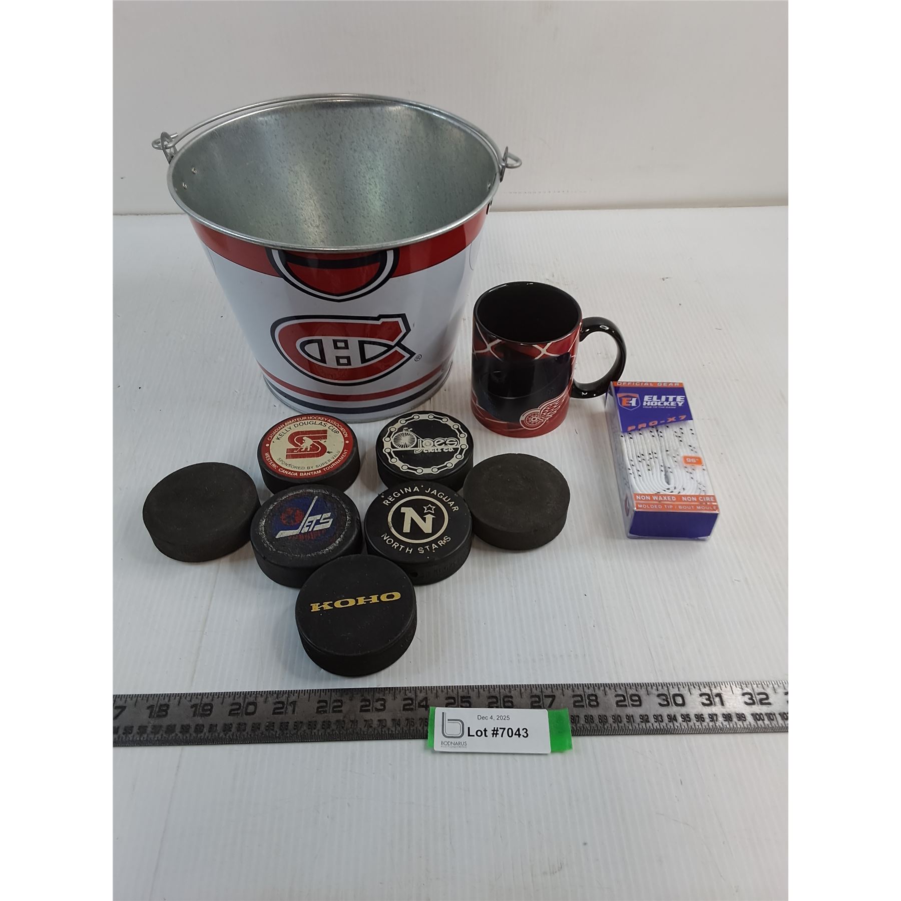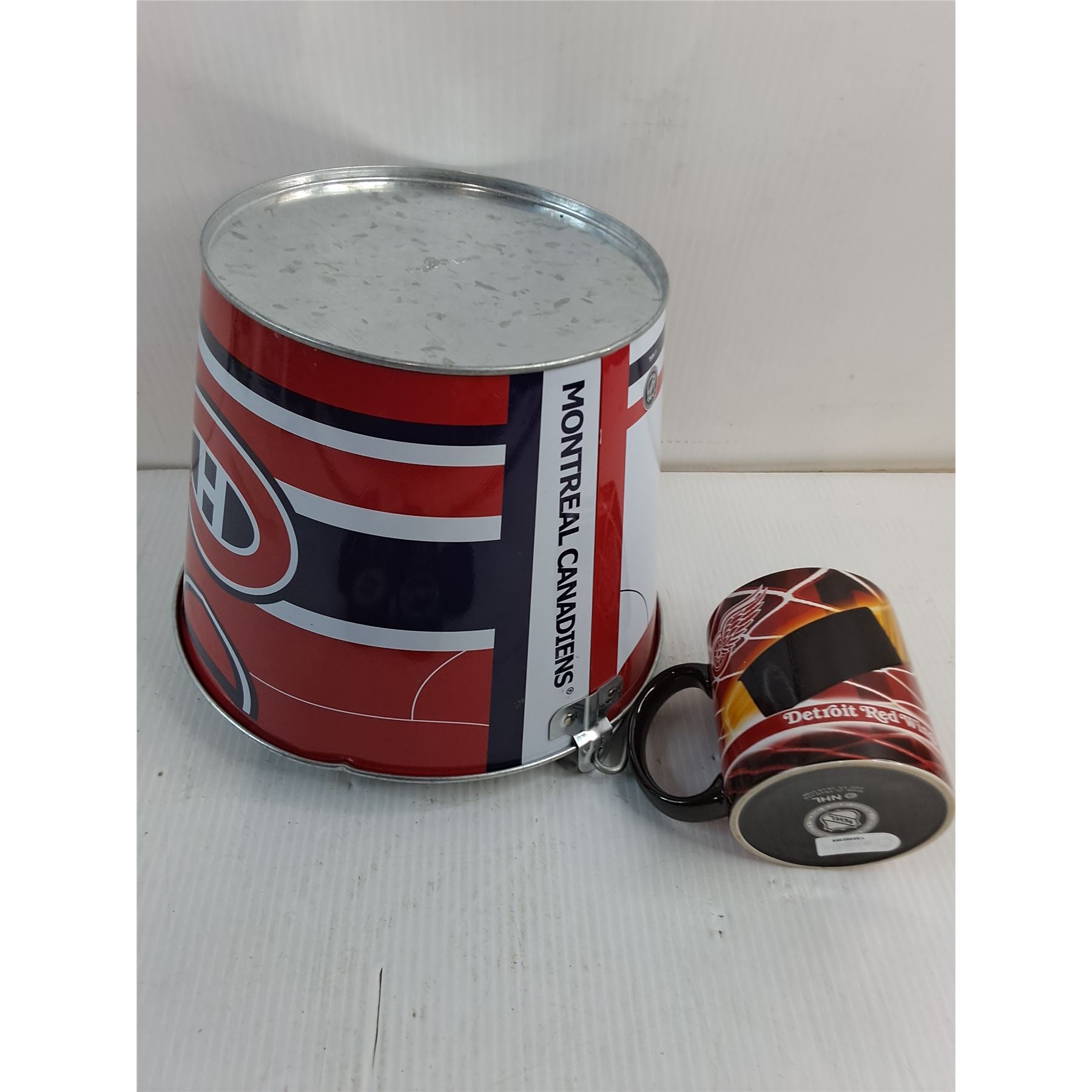 Steel Montreal Canadiens Garbage Can, 7 Pucks, Detroit Redwings Coffee Mug, NIB Hockey Skate Laces