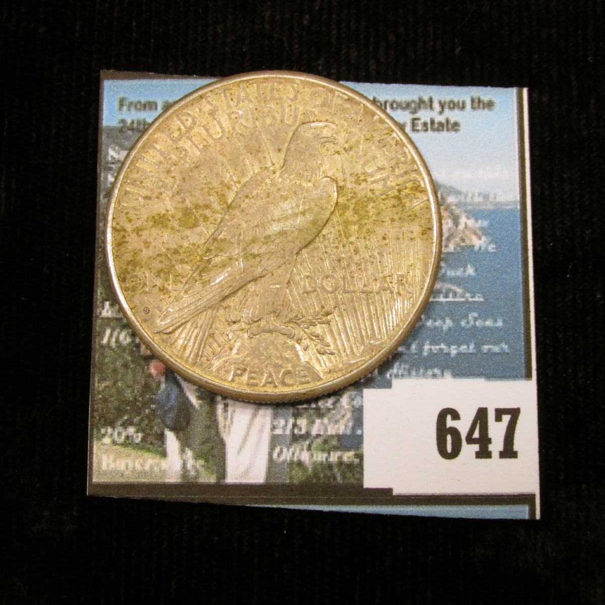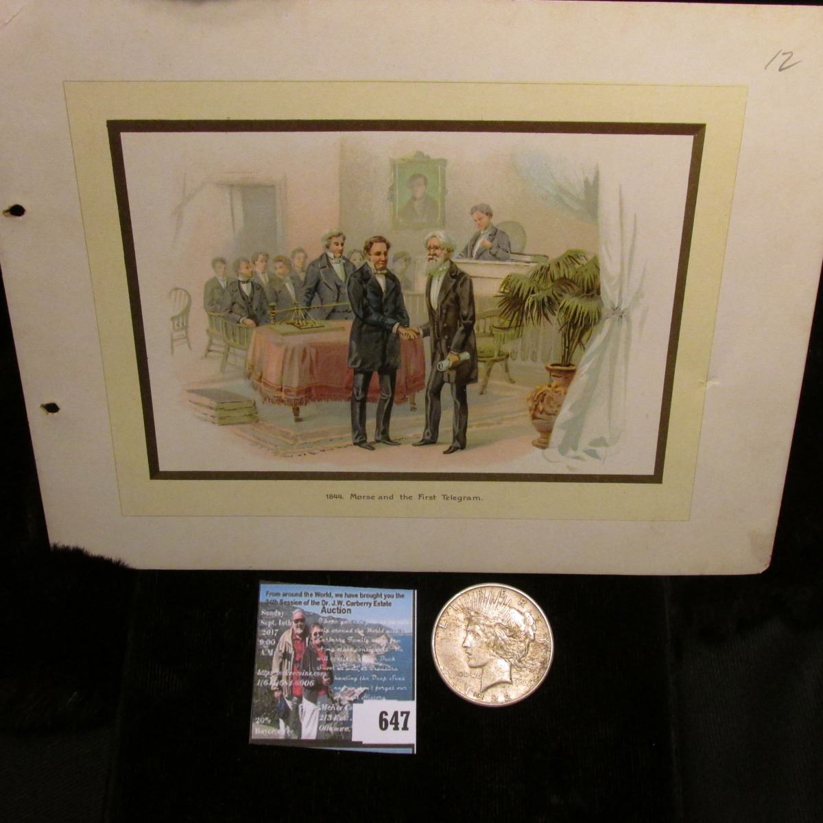 Steel Plate engraved color added print of "1844. Morse and the First Telegram"; & 1922 S U.S. Peace Silver Dollar, VF, toned.