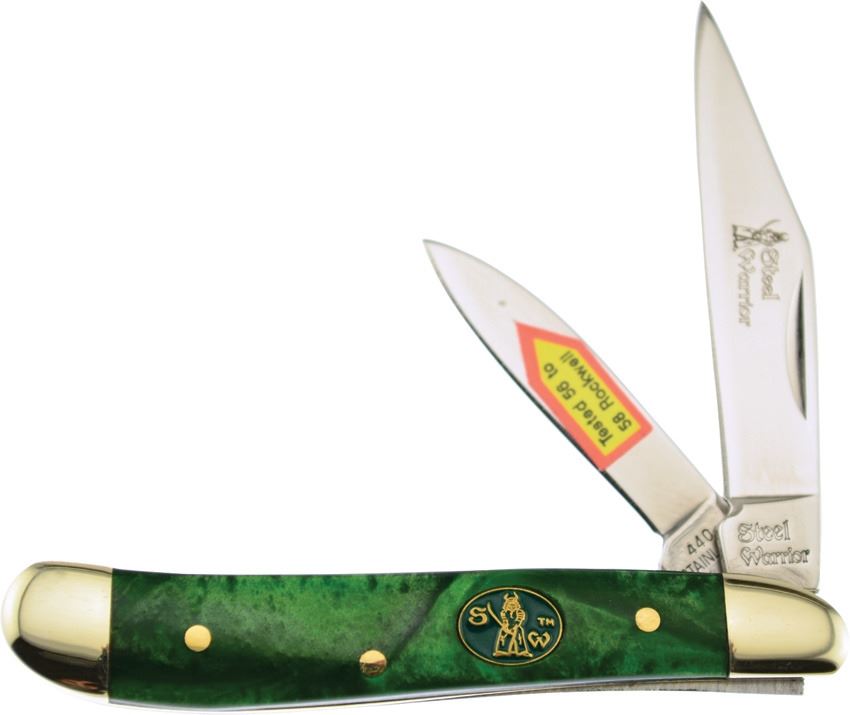 2 7/8" closed. Stainless clip and pen blades. Leaping lizard (green and black) composition handles with nickel silver bolsters and Steel Warrior inlay shield.