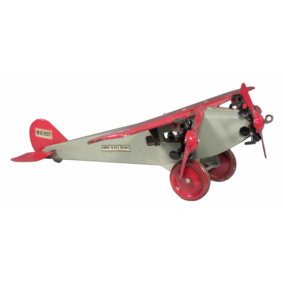 Steelcraft Tri Motor Airplane. Army Scout Plane. Grey/Red pressed steel, all original. Very good condition. 23 inches long X 23 inch wingspan.