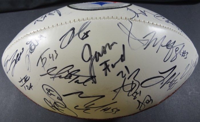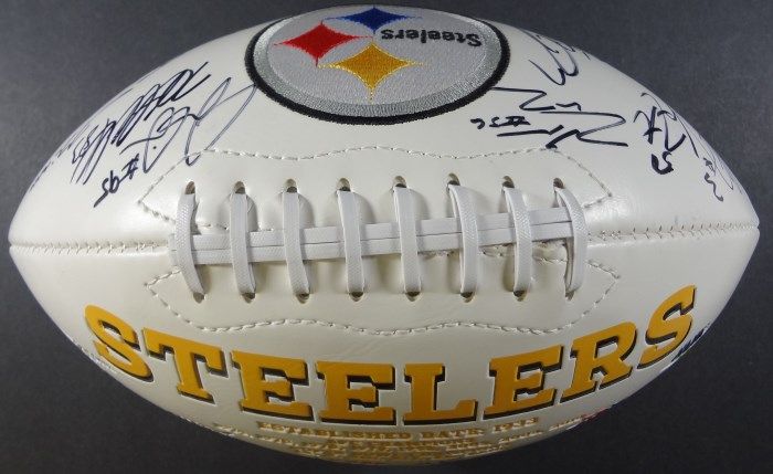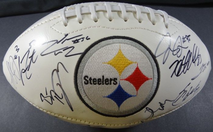 STEELERS "Established Date: 1933 AFC Champions 1974, 1975, 1978, 1979, 1995, 2005, 2008, 2010 Super Bowl Champions IX, X, XIII, XIV, XL, XLIII" Football signed by Steelers Team - 23 Signatures. No COA. Est. Value $125.00 - $175.00.