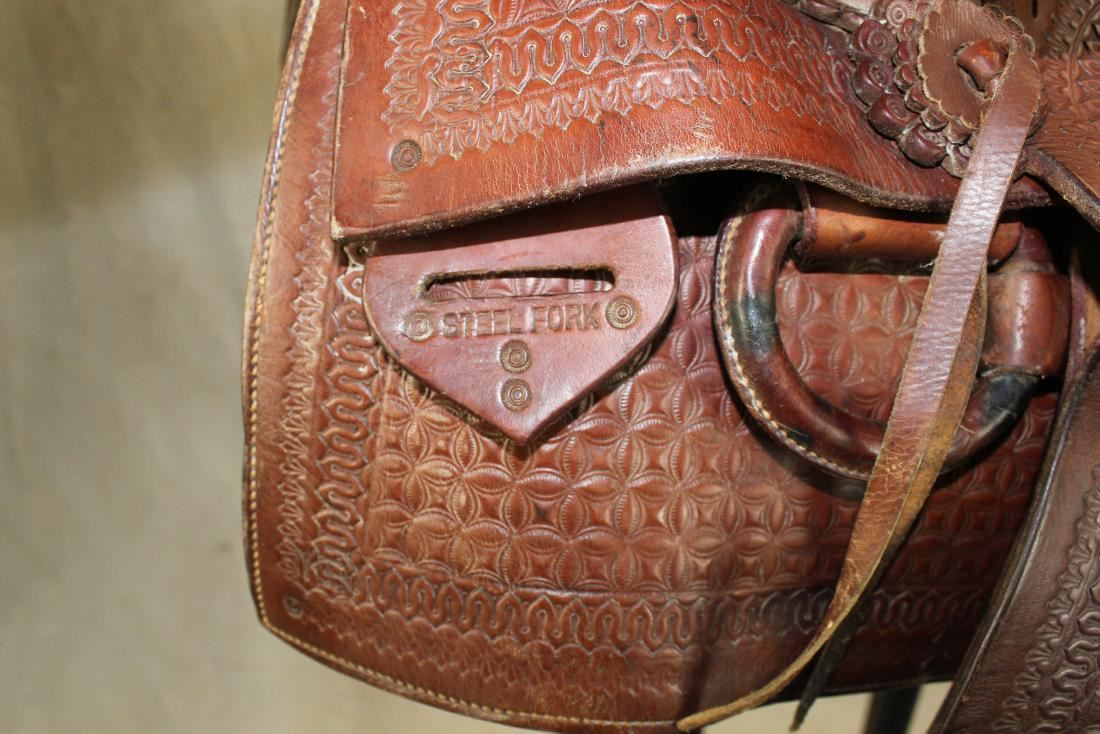 Large square skirt saddle covered in interesting stamp pattern with over sized fenders, high cantel, wide swells and 15" seat.